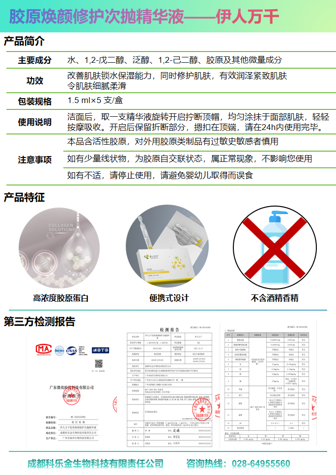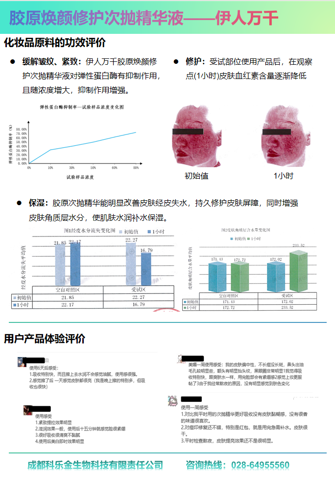 缓解皱纹、紧致:伊人万千胶原焕颜修护次抛精华液对弹性蛋白酶有抑制作用,且随浓度增大,抑制作用增强。 修护:受试部位使用产品后,在观察点(1小时)皮肤血红素含量逐渐降低 保湿:胶原次抛精华能明显改善皮肤经皮失水,持久修护皮肤屏障,同时增强皮肤角质层水分,使肌肤水润补水保湿。